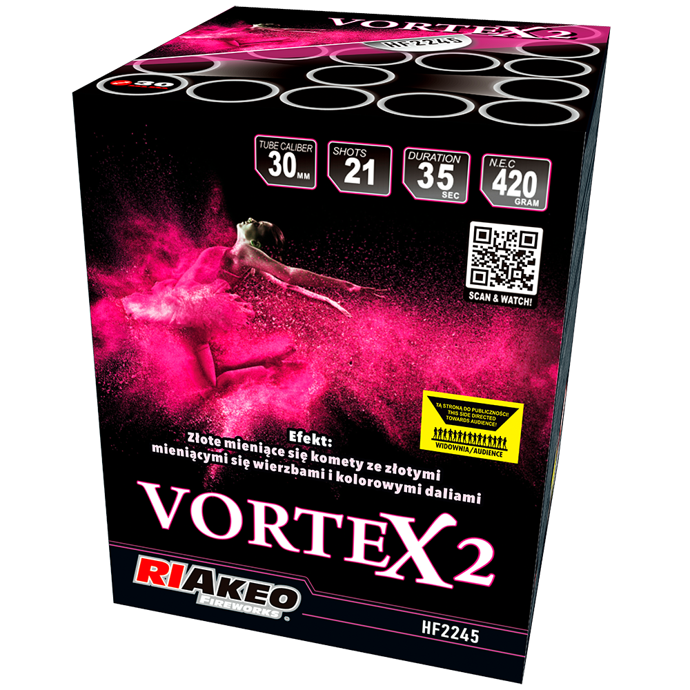 VORTEX 2 (kod HF2245) od renomowanego producenta RIAKEO to wyrzutnia pirotechniczna zaprojektowana z myślą o spektakularnych, premium efektach. Produkt zawiera 21 strzałów o kalibrze 1.2″ (~30 mm), które sięgają wysokości do 35 metrów. Układ efektu łączy sekwencję prostą z kątową, dzięki czemu pokaz zyskuje dynamikę i przestrzenność.